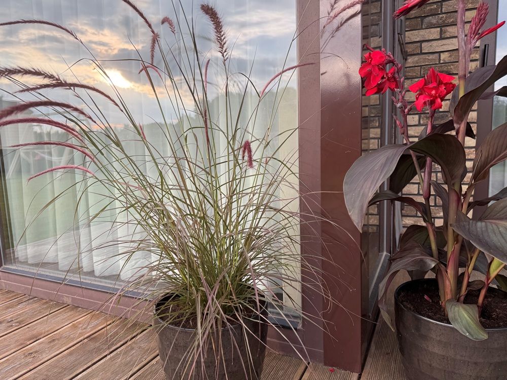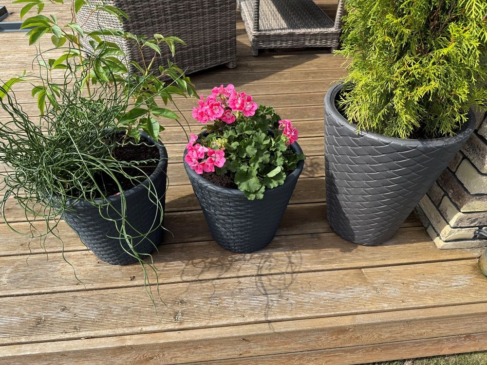 Aukštesni vazonai terasoje, priderinti prie namo spalvų.