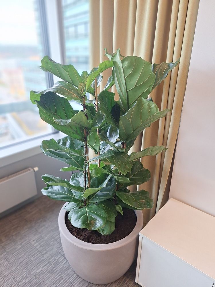Įgyvendinta interjero apželdinimo idėja – į didelį dekoratyvinį vazoną pasodintas aukštas Ficus lyrata. Augalas pasirinktas dėl savo išraiškingos formos, suteikiančios erdvei natūralumo, žalumos ir gyvumo.