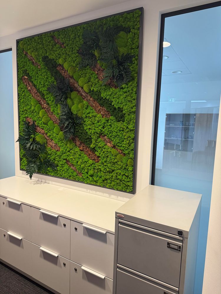 Naujas stabilizuotų samanų paveikslas ir individualiai pagamintas vazonas su dirbtiniais ir stabilizuotais augalais tapo išraiškingais interjero akcentais, kurie suteikia aplinkai jaukumo bei estetikos. Atnaujintas turimas paveikslas atrodo ryškesnis ir puikiai dera prie kitų dizaino elementų. Bendra biuro atmosfera tapo gyvesnė, modernesnė ir labiau atspindinti įmonės vertybes bei įvaizdį.